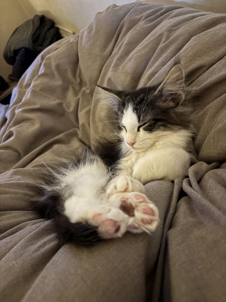 12月の頭に来た時は700gくらいの小さな子猫でしたが、やはり大型猫です。1月下旬には体重も2キロほどになり足腰もしっかりしてきました。すごく筋肉質なんです。