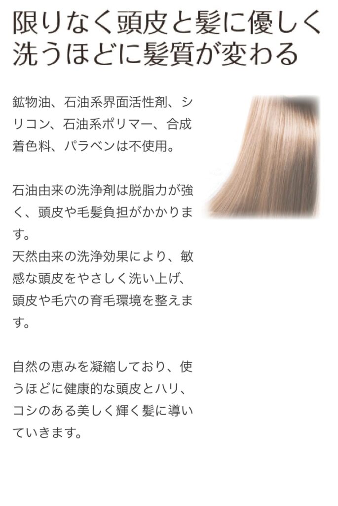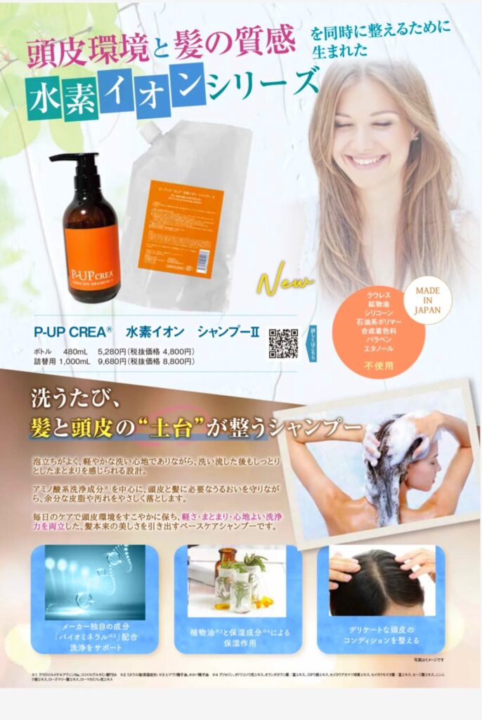 水素イオンの力で洗うたびに髪と頭皮の土台が整うシャンプーです。当店のメニュー、プラチナコースで利用使用します。